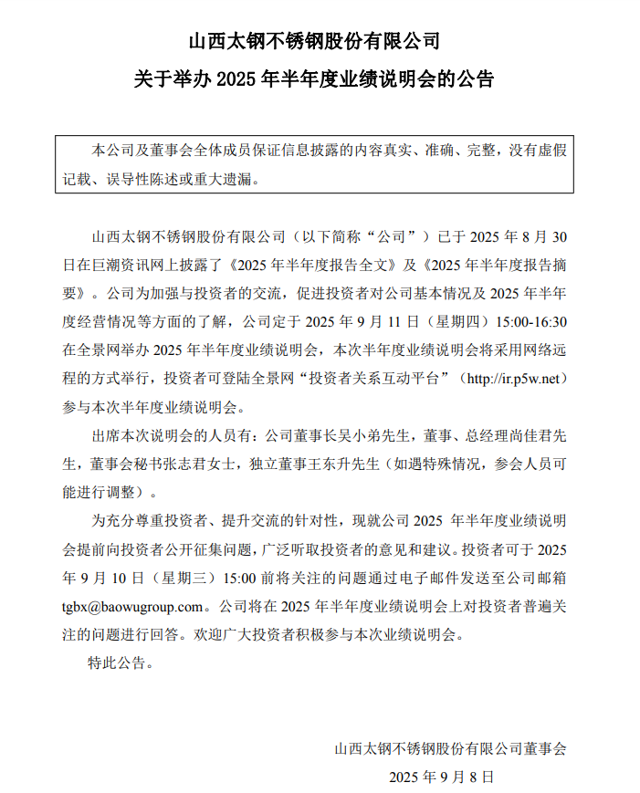 9月9日,山西太鋼不銹鋼股份有限公司發(fā)布關于舉辦 2025 年半年度業(yè)績說明會的公告。公司定于 2025 年 9 月 11 日(星期四)15:00-16:30 在全景網舉辦 2025 年半年度業(yè)績說明會,本次半年度業(yè)績說明會將采用網絡遠 程的方式舉行。